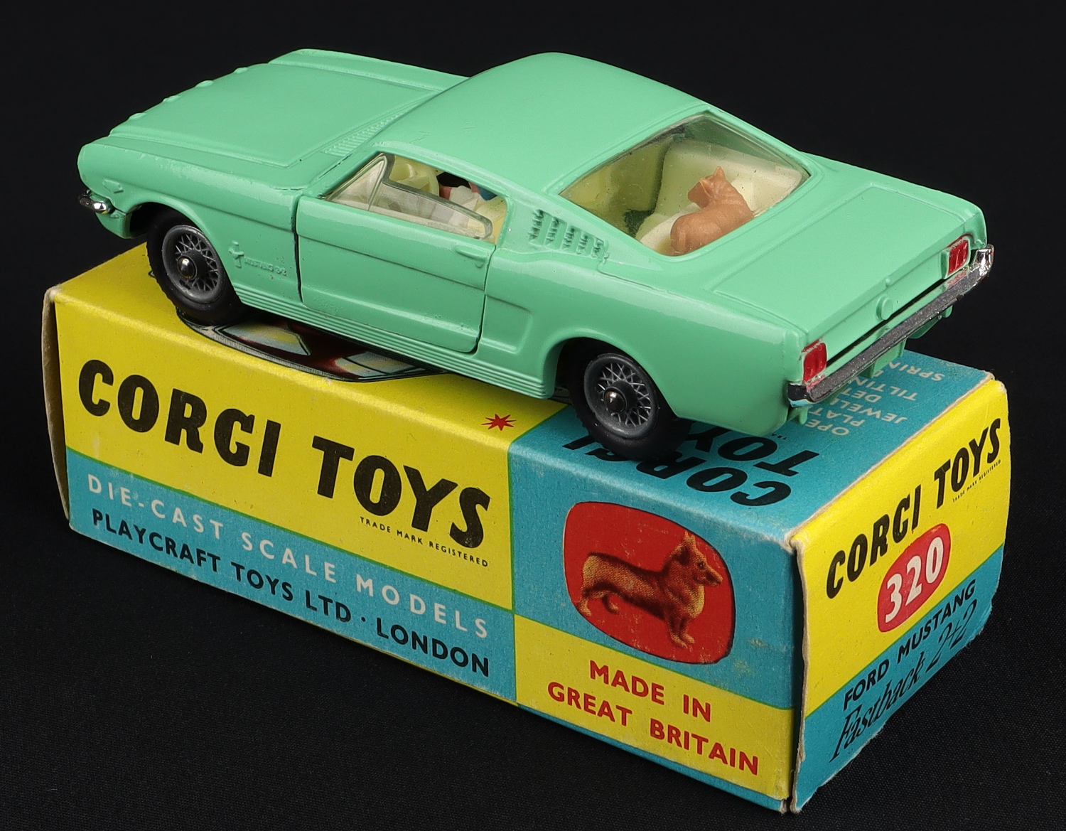 Ford Mustang Fastback 2+2 by Corgi Toys, No. 320. Very near mint/boxed. Light green version with spoked wheels. From The Rickman Collection.