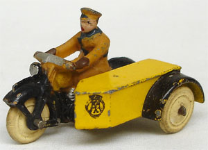 2) Dinky 44b Motor Cycle Patrol. Earliest issue (1935-40) with more detailing to the tan rider, and intact solid white rubber wheels. A little light chipping at some exposed edges. Tiny hairline crack at the rear of the side car. Still an excellent example from this period.