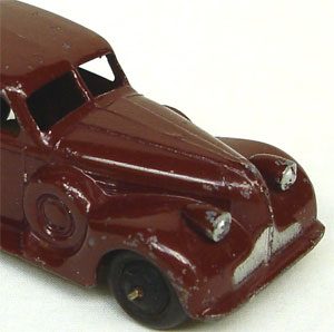 This car has a rich, deep original maroon finish with a black early railed baseplate and black ridged hubs. Mostly light chipping at exposed edges. Bright baseplate and axles.
