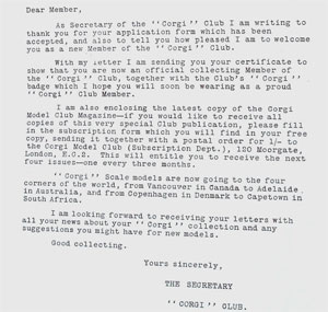 as well as a printed letter from the Corgi Club secretary: