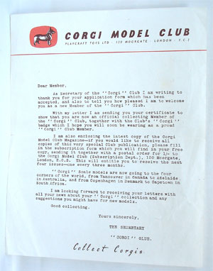 Original Corgi Club Membership Certificate with accompanying letter from Corgi and original boxed Corgi Club Badge!