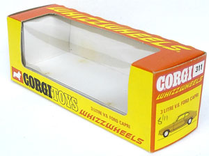 Corgi 311 3 Litre V6 Ford Capri. Very near mint/boxed. Fluorescent orange with red spot wheels.