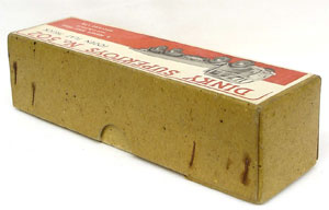 The early buff box looks splendid too with strong colours on the bright, clean and complete paper label. Shopkeeper’s neatly penned price of 10/- at one end as well as a Dinky factory stamp ‘B’ to denote the colour of the model. Card is sturdy and undamaged. Some rusting at the staples and faintly visible pencilled writing on one side of the lid.