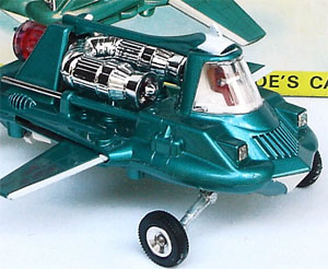 A superb example inspired by Gerry Anderson’s t.v. series Joe 90, in pristine finish, complete and all original. Bright metallic green with gleaming chrome engines. Opening wings and extending tail fins. Suspension on all four wheels. Battery powered engine exhaust – which has been tested and the light works! Jewelled headlights.
