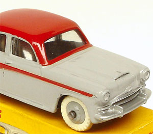 In light grey finish with a red roof, red flash at the sides, matching light grey wheels, white knobbly tyres. Interestingly, the Austin A105 was the first Dinky car to be made with window glazing!
