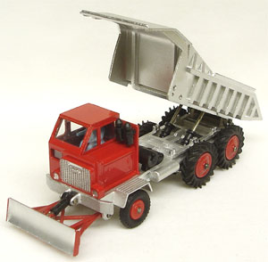 Made between 1961-68, this version is finished in red with a silver tipper and chassis, red wheels (correct that the two front wheels are plastic, the rest are metal).