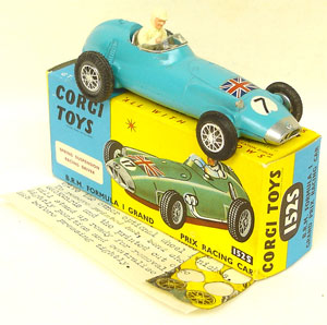 Condition: Very near mint with a small edge portion of the racing number rubbed off and a casting mark at the rear. Wheel stickers have been applied (the other two are still on the backing sheet inside the box, along with the Corgi Club Membership Form and instructions).