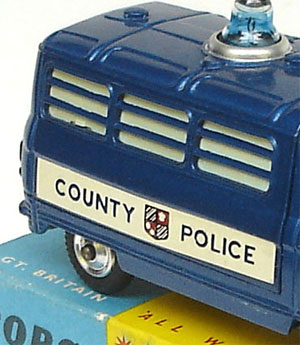 Issued between 1967-68 (with variations), this model has a bright mid-metallic blue finish, light blue roof light and perfect ‘County Police’ labels on one side, couple of little edge nicks on the other.
