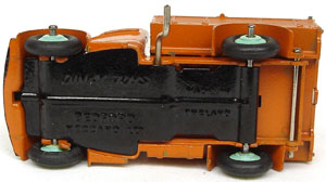 In fine, all original condition with a distinctive deep orange paint finish throughout and light green wheels. This scarce Dinky truck presents very well with bright metal parts (winding handle, baseplate, tail gate bar, axles, including ends). Occasional small rub may be seen at the raised side and rear body line details. Small paint miss on the inside vertical surface of the wagon back. A little as-made paint bubbling to the bed.