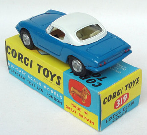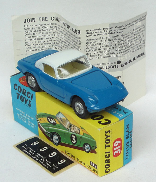 Corgi 319 Lotus Elan Coupe. Very, very near mint/boxed. With leaflet & racing number sheet. Outstanding fresh box! From a very fine private Cheshire collection.