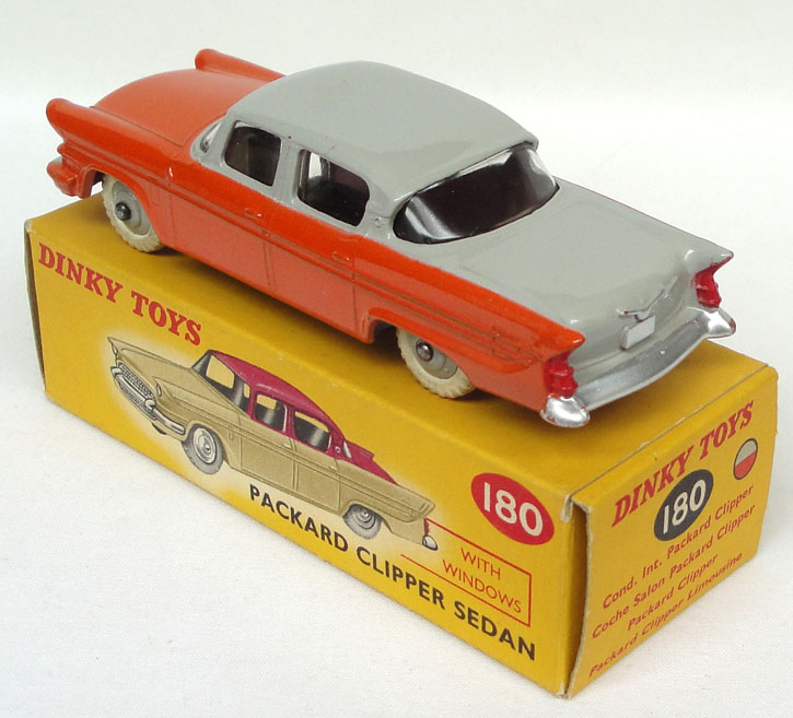 Dinky 180 Packard Clipper Sedan. Orange & pale grey version. Near mint/boxed. From the 1200 model Italian collection. Old shop stock quality box!