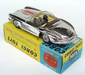 Corgi 303S Mercedes-Benz 300Sl Open Roadster. Very,very near mint/boxed. Scarce version in chrome with a yellow & brown interior and shaped spun wheels. Beautiful example from the Italian collection!