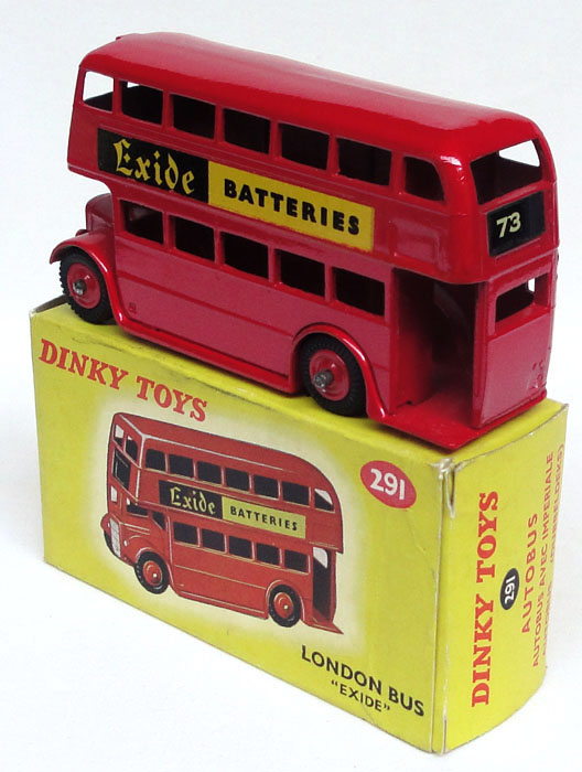 Dinky 291 London Bus "Exide". Mint/boxed. Rare variant with RED PLASTIC wheels, correctly presented in late (paler yellow) box. From the Italian collection.