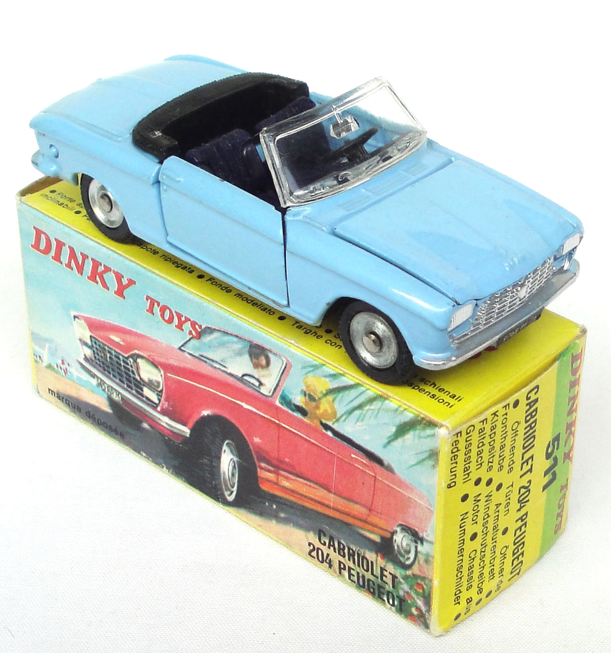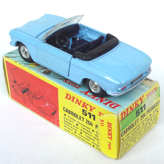 French Dinky 511 Peugeot 204 Cabriolet. Light blue, dark blue seating. Very near mint/boxed. Scarce. Superb condition from the Italian collection.