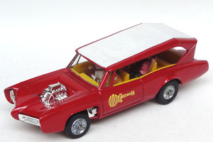 This model was inspired by the t.v. show ‘The Monkees’ and was issued between 1968-72. It is a superb example with a bright red finish, white roof, detailed cast wheels, complete with all four figures inside. Perfect ‘Monkees’ transfers on one side, very nearly so on the other ( (tiny section of one letter ‘e’ has rubbed away). Bright chrome engine detail. Not a mark on the white roof and there is none of the usual rubbing at the nose of the vehicle.