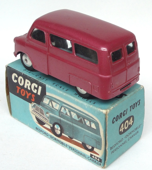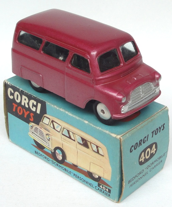 Corgi 404 Bedford "Dormobile" Personnel Carrier. Near mint plus/boxed. Light metallic cerise version. From the Italian collection.
