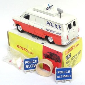 Dinky 287 Ford Transit Van 'Police Accident Unit'. With packing ring and all accessories. Unopened original bag containing the bollards. Very near mint/boxed (puncture). Early issue.