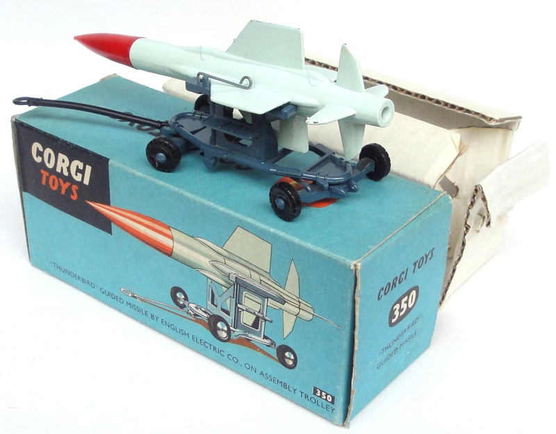 Corgi 350 Thunderbird Guided Missile on Assembly Trolley. Very near mint/boxed with packing piece. Rare Duck Egg Blue missile. From a very fine private Cheshire collection.