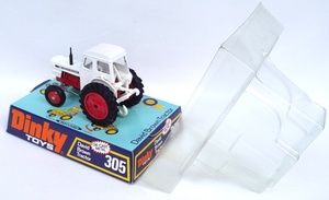 Dinky 305 David Brown Tractor. Very, very near mint/boxed. Scarce issue in in white, with red wheels. 'CASE DAVID BROWN' In clear intact bubble packing. Old shop stock quality from the impeccable collection in the Netherlands.