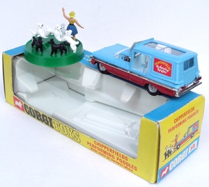The blue and red Chevrolet Pick Up with cast wheels, is in fine original condition, with comical “moving” (variview) Dachsund sticker above the cab roof (starting to lift at one side), and intact ‘PERFORMING POODLES’ labels on both sides. Perfect suspension on all four wheels and gleaming chrome. We have not seen better!