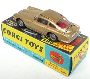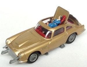The Aston Martin DB5 is attractively finished in deep gold. Fully functioning, complete with both figures of James Bond and villain. Suspension on wire wheels. Fine tread, split-free original tyres. A few small marks to the roof and surround (minor).